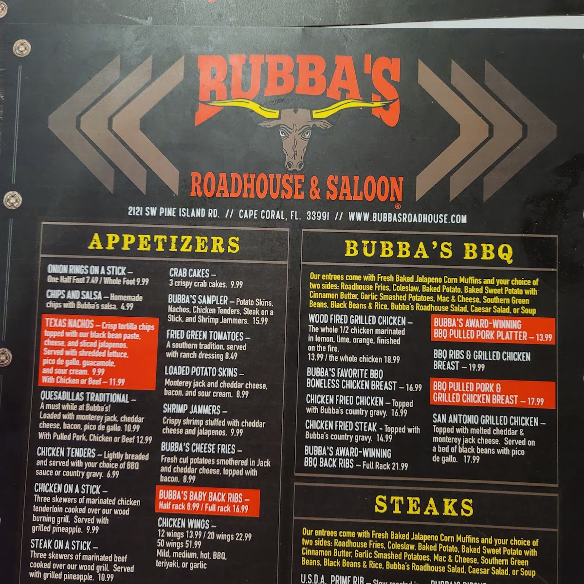 Welcome to Bubba's Roadhouse & Saloon, a culinary gem nestled in Cape Coral, Florida. This vibrant eatery boasts an enticing menu that caters to a variety of palates, with a focus on BBQ delights and hearty entrees. Diners can explore a range of mouth-watering options such as the BBQ Baby Back Ribs priced at just $19.99, or the flavorful Wood Fired Grilled Chicken, marinated with zesty citrus and herbs, starting at $13.49.